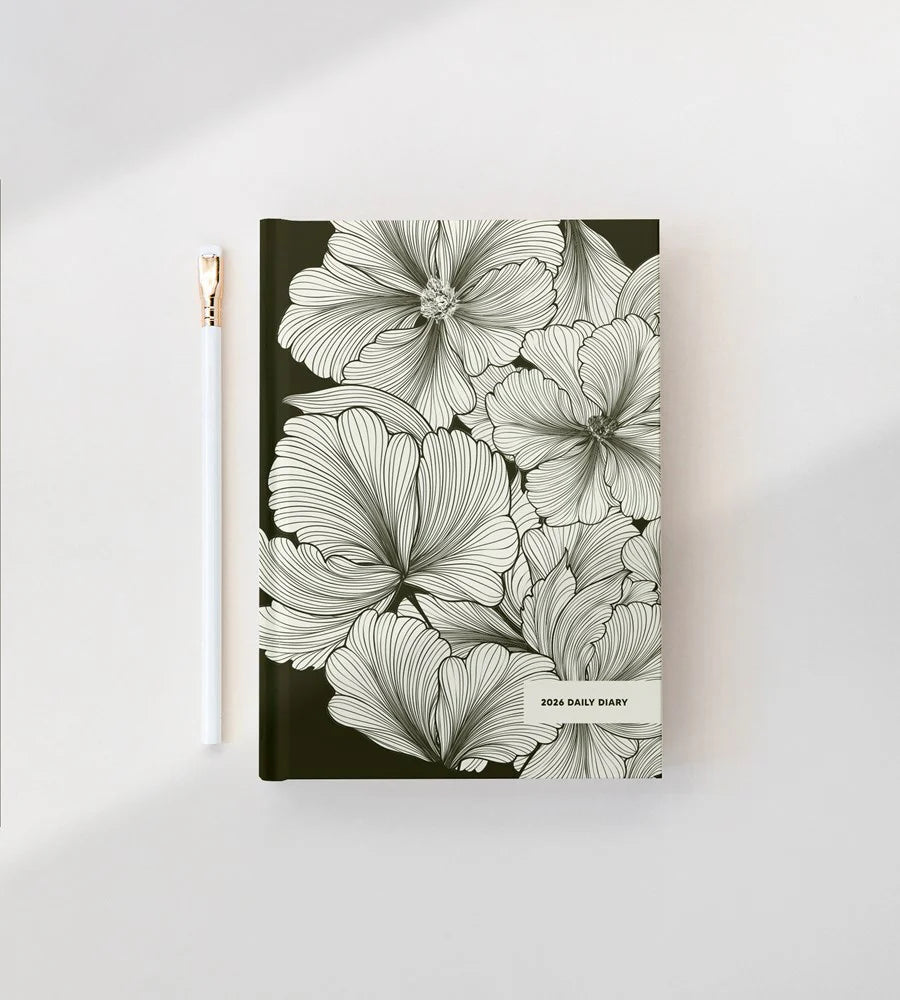 Meet your new planning companion - the Olive Deco Daily Diary 2026 by Father Rabbit! Whether you're jotting down brilliant ideas, tracking your reading list, or planning your next adventure, this charming A5 hardcover diary has you covered. With a full page dedicated to each day, you'll never feel cramped for space to capture your thoughts and tasks. The cleverly organised to-do lists keep you on track across six delightful categories: Read, Watch, Buy, Listen, Do, and Make - because life is wonderfully multifaceted and busy. The monthly double-page spreads let you zoom out and see the bigger picture, perfect for spotting patterns and celebrating progress. Thanks to the lie-flat cover design, you can write comfortably anywhere, anytime. Plus, the handy ribbon marker ensures you're always exactly where you need to be. Wrapped in a sophisticated olive colour and linework floral cover, this diary proves that staying organised can be both stylish and fun.