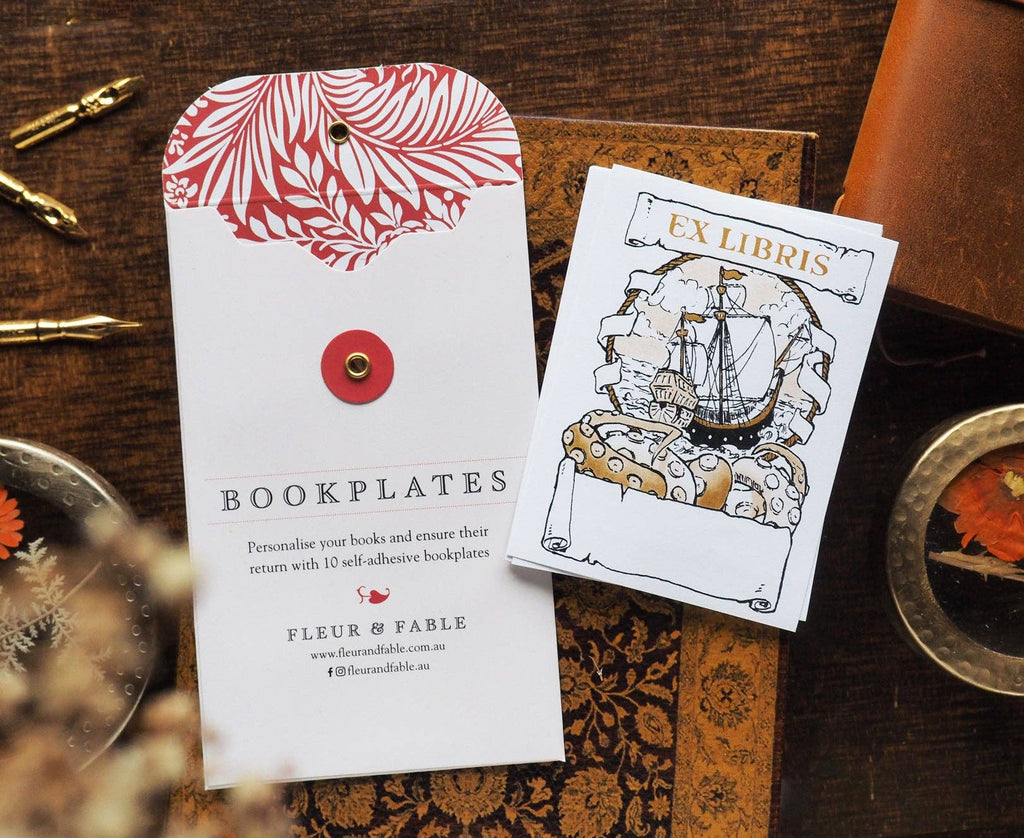 This vintage bookplate style is inspired by the golden age of illustration in the early 1900s. These ex libris bookplate stickers have been printed in black and a special metallic gold ink making these a beautiful addition to your books.