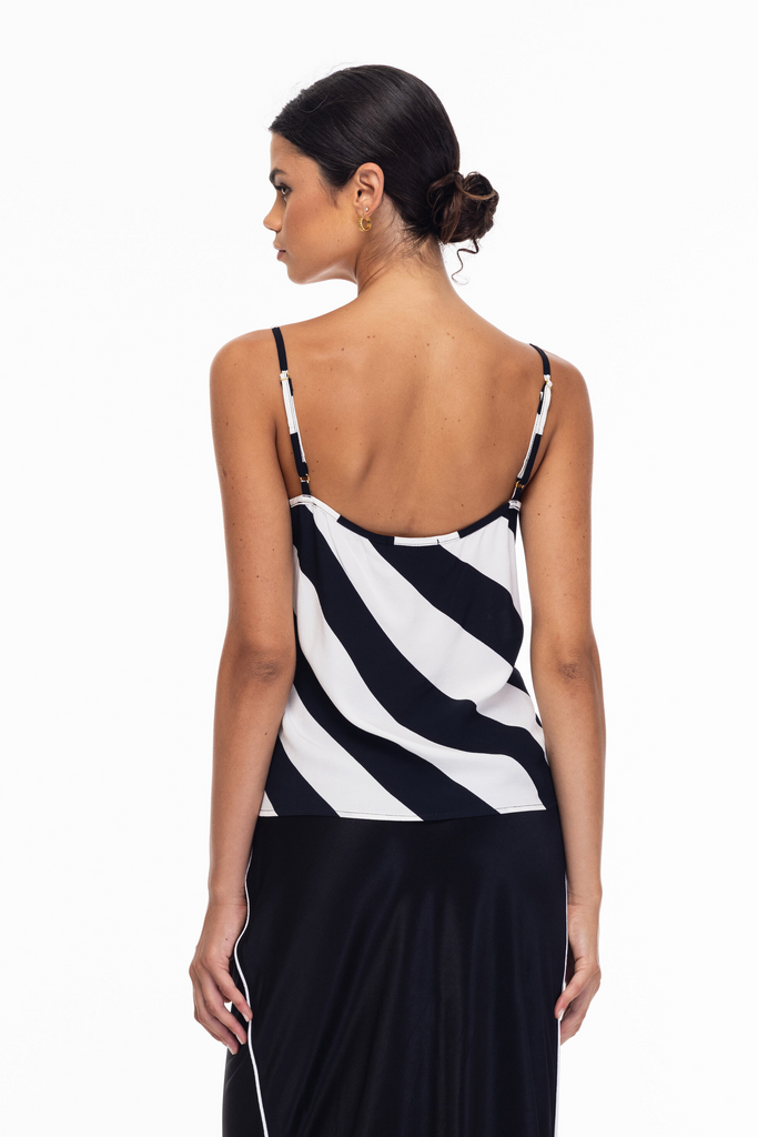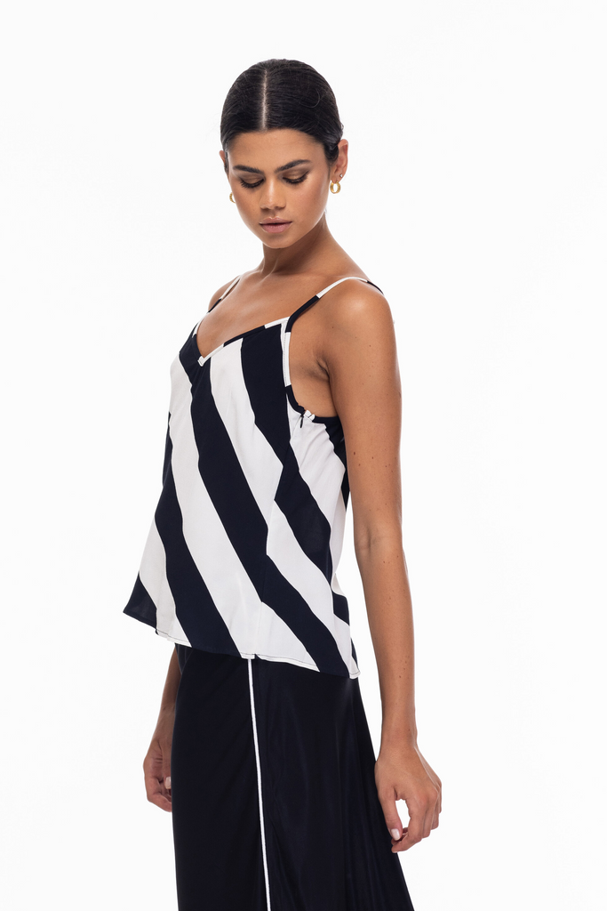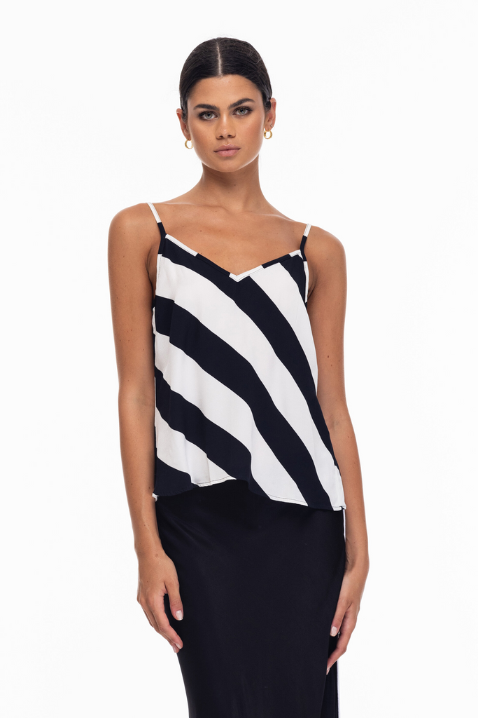 Experience luxury and style with the Remi Top - Black/White Diagonal Stripe. Made with high-quality viscose, this top features a striking black and white diagonal stripe design. The bound v-neckline and concealed zip in the side seam add a touch of elegance, while the adjustable straps allow for a customisable fit. Elevate your wardrobe with this exclusive must-have piece.