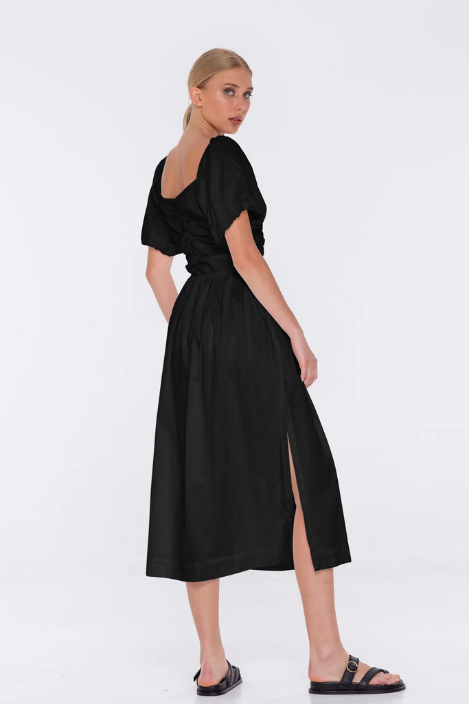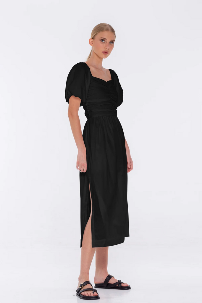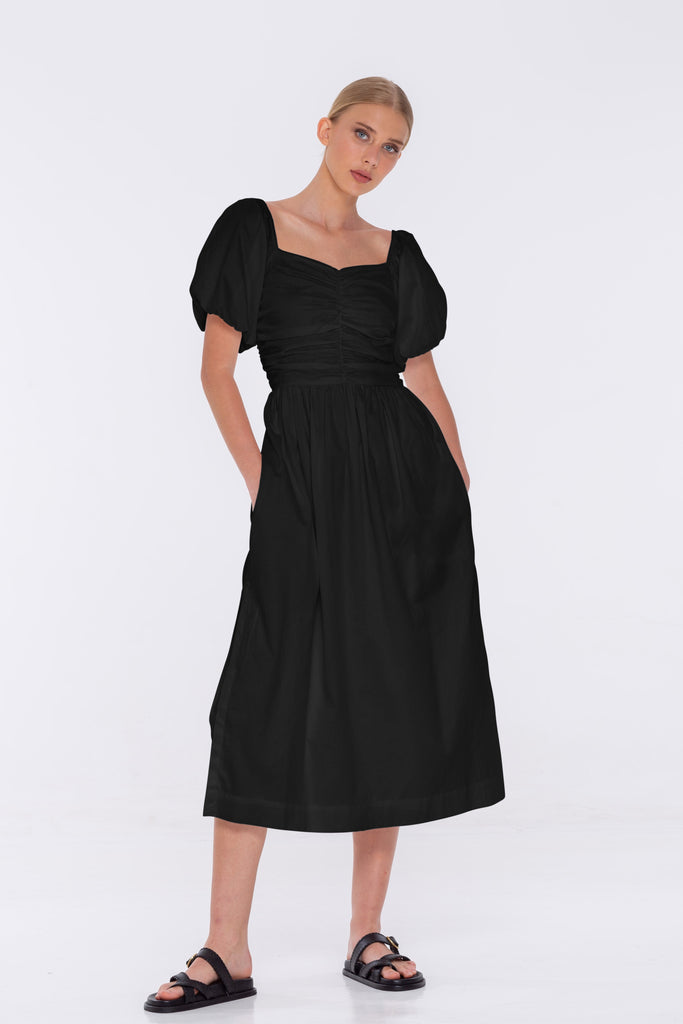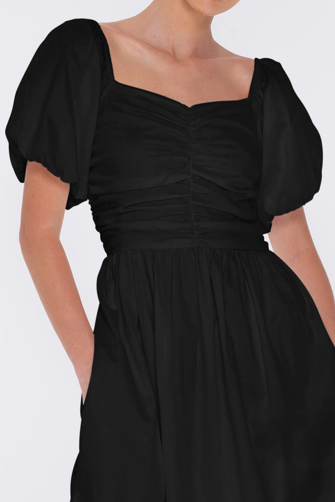 The With Love dress is such a fun take on the LBD for spring featuring a sweetheart neckline, ruched bodice, short puff sleeves and gathered midi skirt.