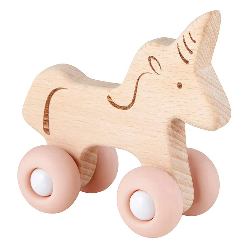 Introduce your baby to this magical wooden unicorn companion! Featuring enchanting design details and smooth silicone wheels that roll with ease, it's the perfect toy for little explorers. The soft silicone components offer soothing comfort during teething while sparking imaginative play. Made from sustainable beech wood and safe BPA-free silicone, this durable toy grows with your child. Hand wash only. At 8 x 8cm, it fits snugly in small hands for on-the-go fun and discovery.
