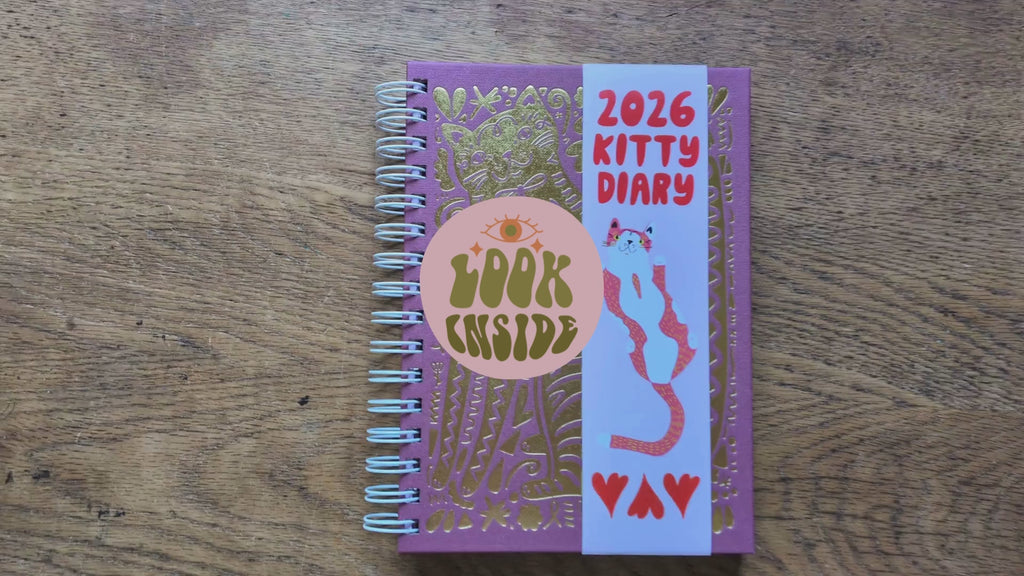 Able & Game's 2026 Kitty Diary is a celebration of cats. Full to the brim with over 200 cat illustrations, this diary will be a joy to use for any cat lover. This diary features a stunning gold foil cat illustration on the cover, 120gsm paper throughout and a handy plastic pocket at the back. The diary is printed and bound in Able & Game's studio and all the components come from other Melbourne based businesses. The diary is A5 in size and is spiral bound with a white coil.