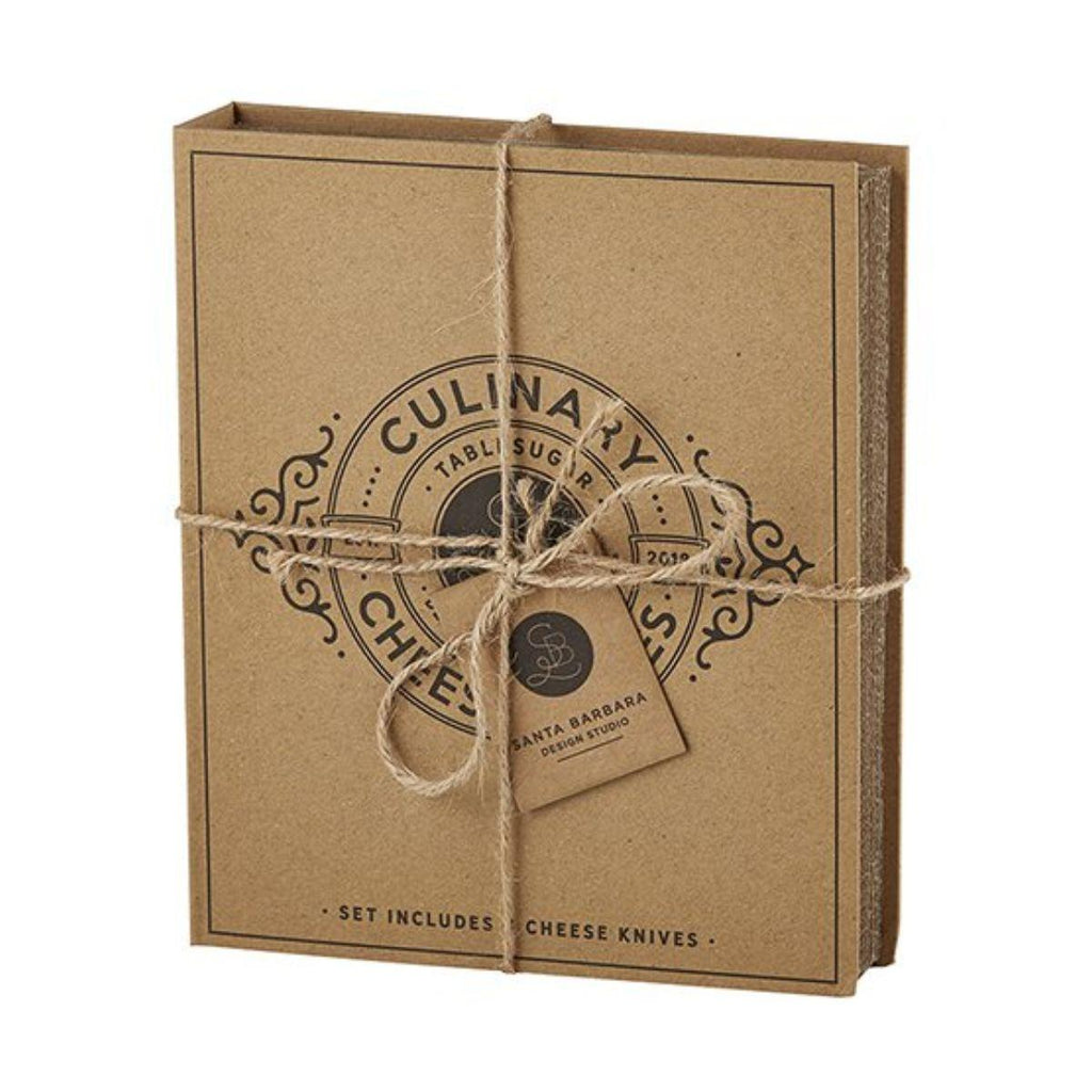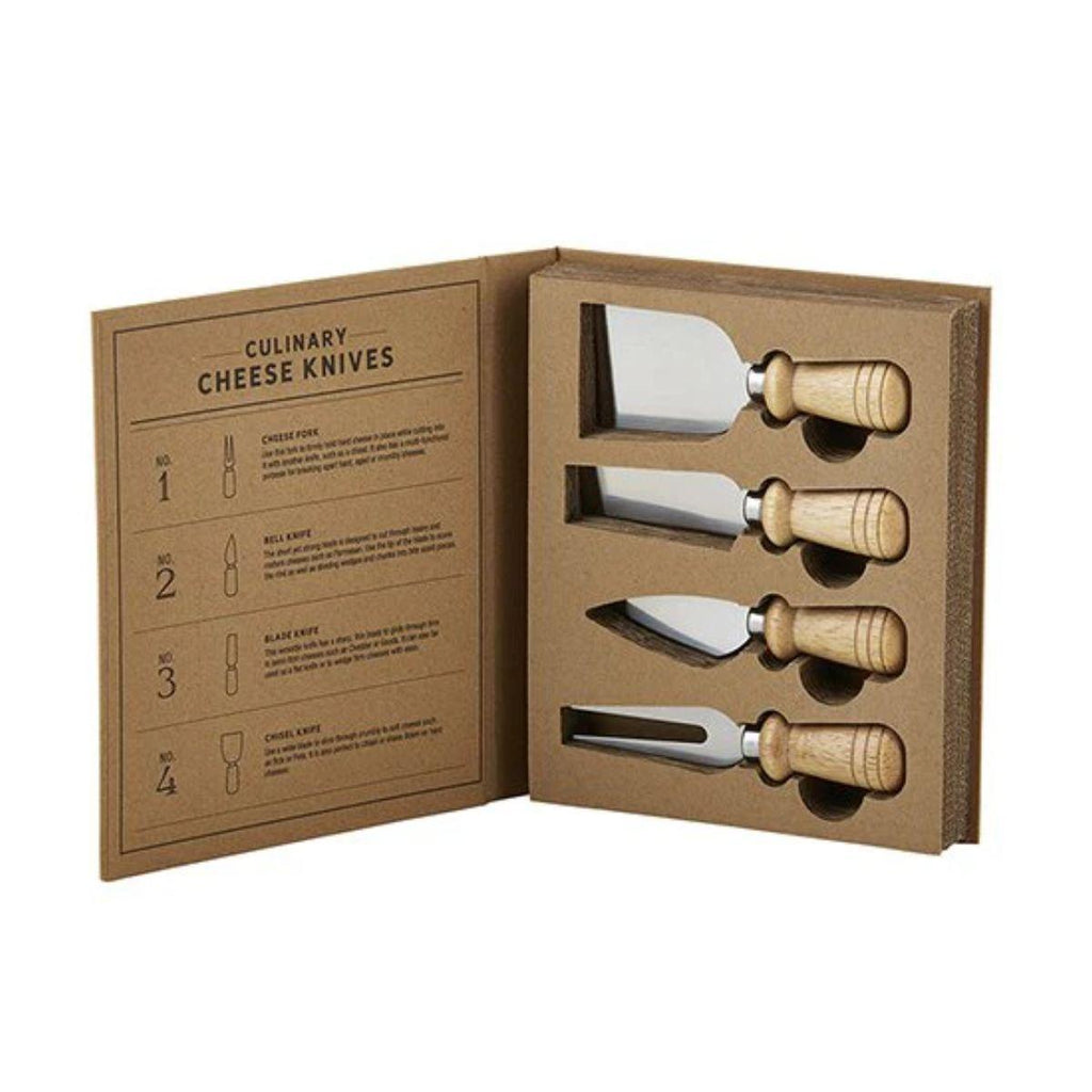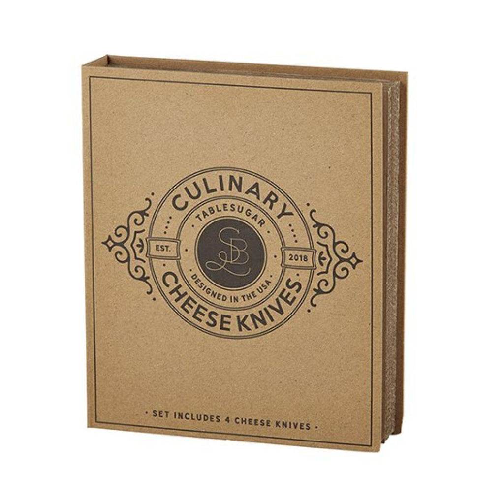 Cardboard Cheese Knife Book Set contains: Cheese Spatula, Cheese Slicer, Cheese Spade Knife, Cheese Fork. Unique cardboard box packaging makes these a great gift for any cheese lover!