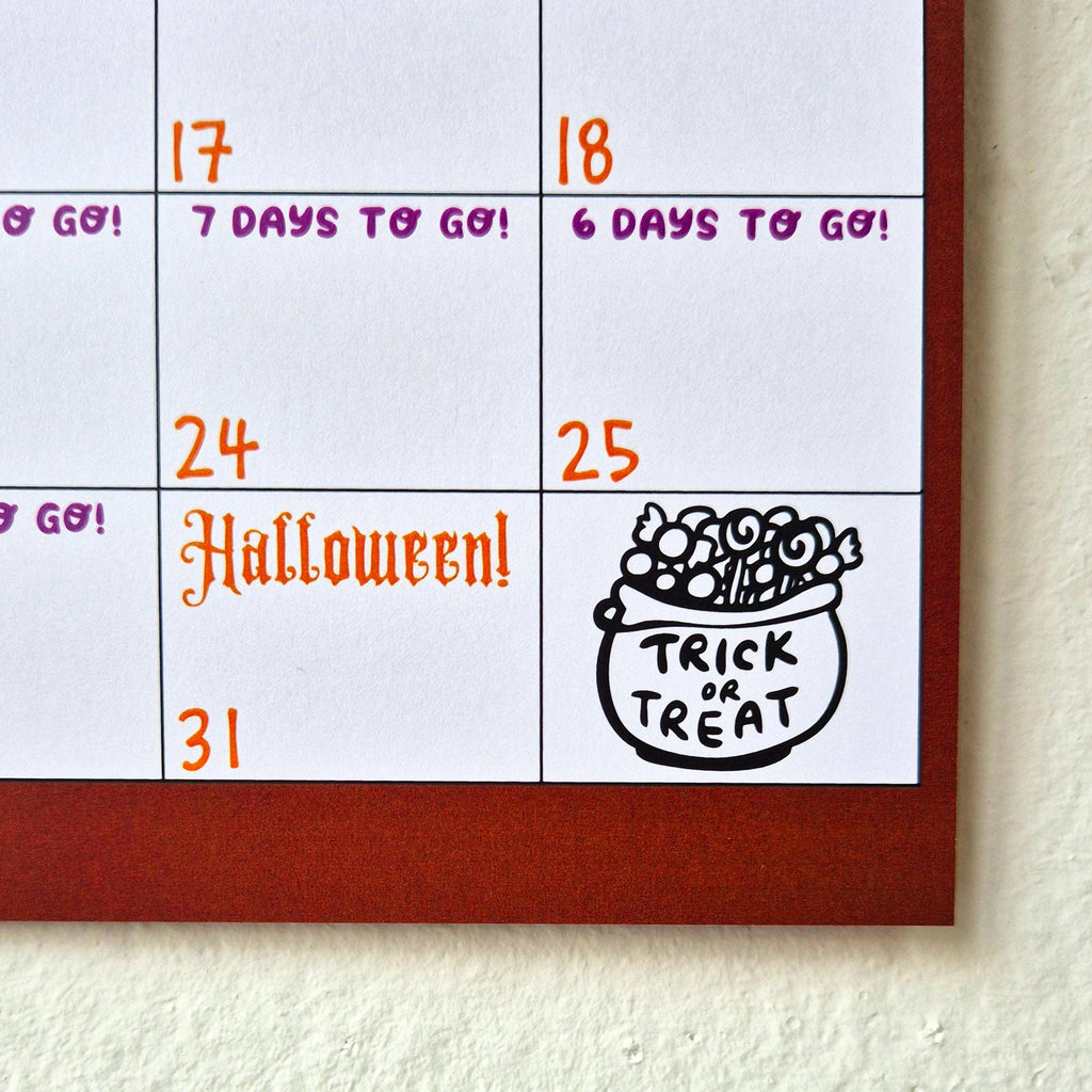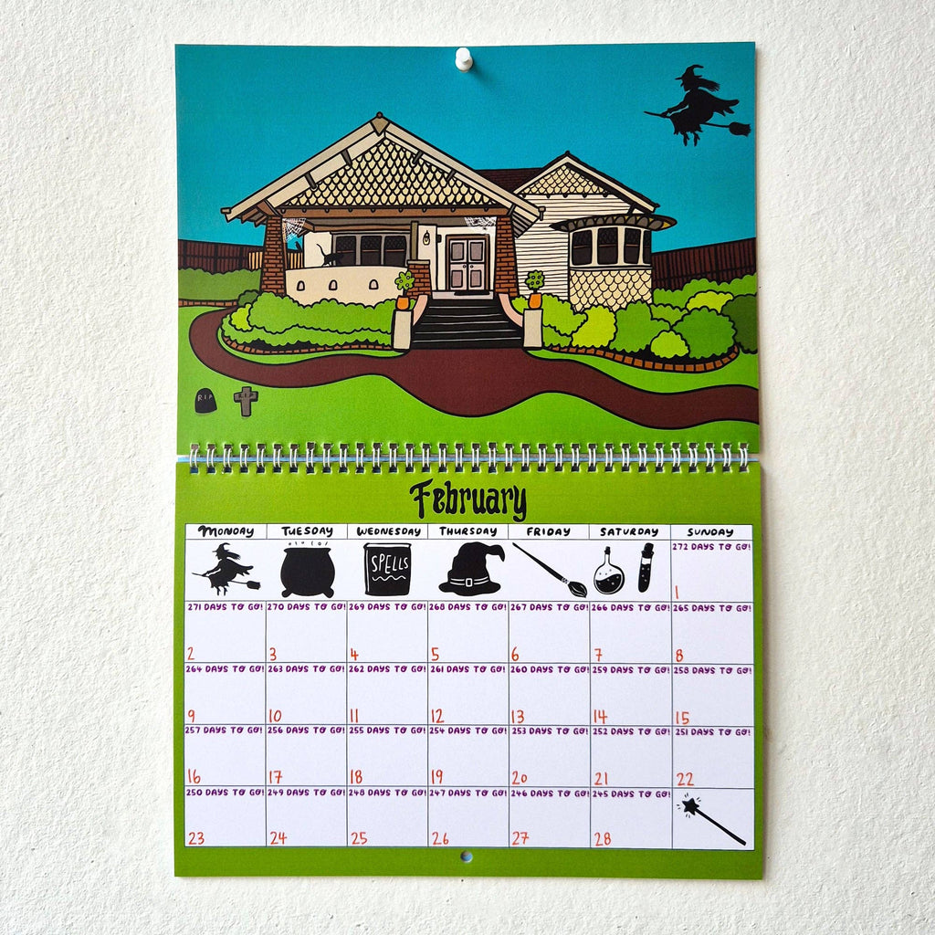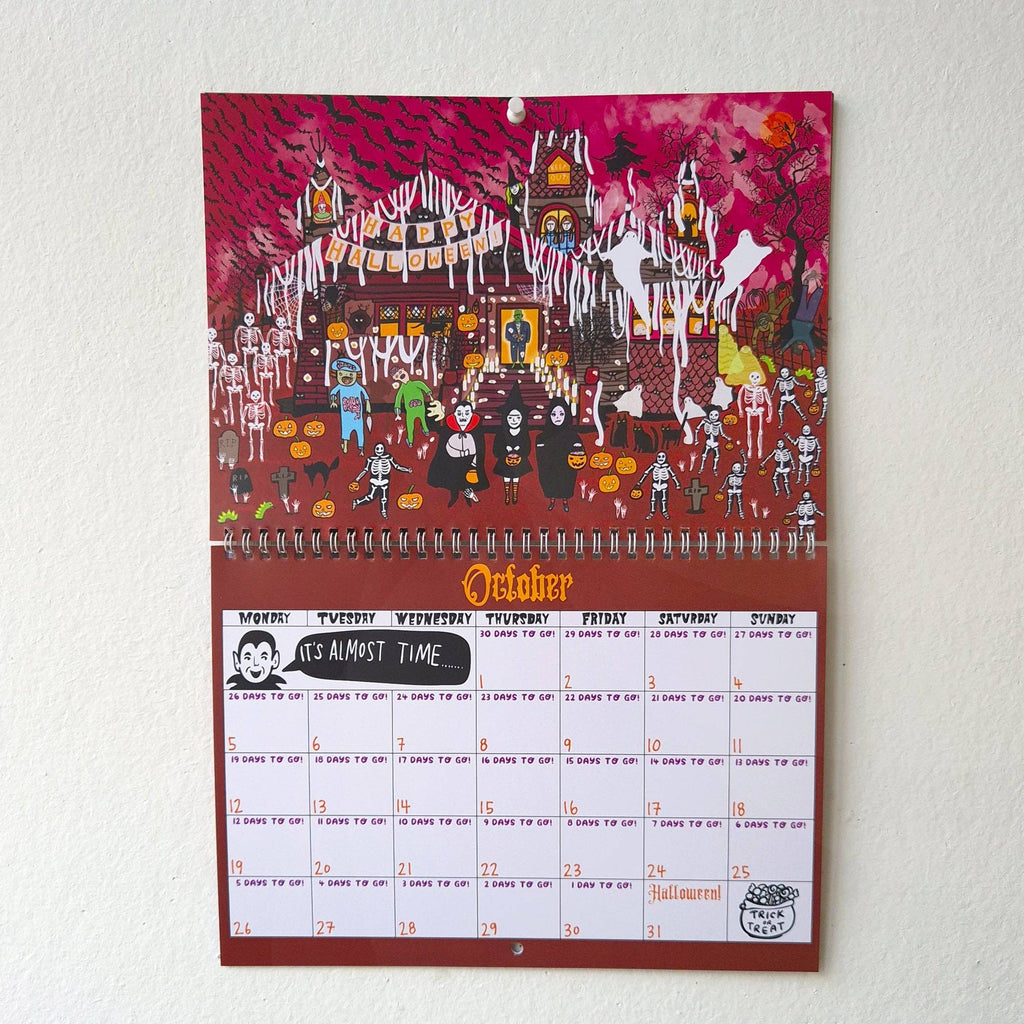 Able & Game's Countdown To Halloween calendar is designed for the Halloween obsessed kid (or grown up!). The calendar starts on November 2026, with an illustration of a home, and each month it becomes progressively more spooky. Each date has how many days until Halloween. November 2026 and December 2026 are also included in a double spread at the end of the calendar. So it can be used for 2026, with two extra months included.